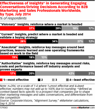 When the top two levels of effectiveness on a scale of 1 (most effective) to 4 (least effective) were combined, visionary insights ranked No. 1, at 65% of respondents. Current insights came in a close second (62%). Meanwhile, authoritative and anecdotal insights, tops in usage, landed at the bottom, with 37% of respondents rating each a 1 or 2.