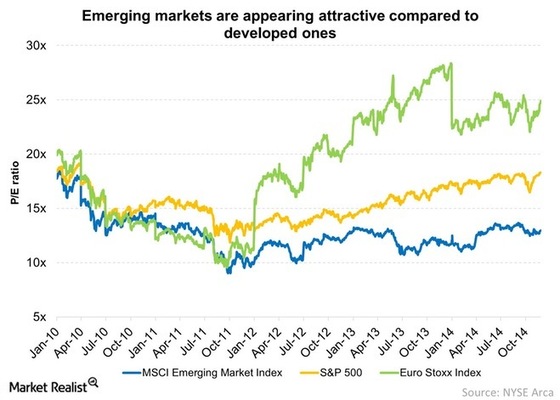 Emerging markets are cheap relative to growth estimates, and they are still growing much faster than developed markets.