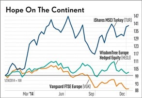 The tumbling euro and geopolitical risk threaten European allocations. Look for opportunities in emerging markets, small caps and currency hedged funds.