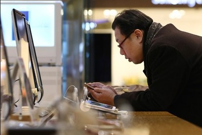 A visitor uses his mobile phone at the Samsung Electronics Co. d’light showroom in Seoul, South Korea, on Tuesday, Jan.