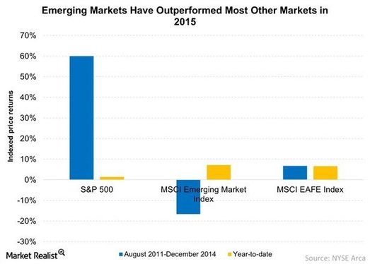 The S&P 500 (SPY) had a stellar 2014, while the emerging markets (VWO) had a sedate year. This year, though, has been a different story.
