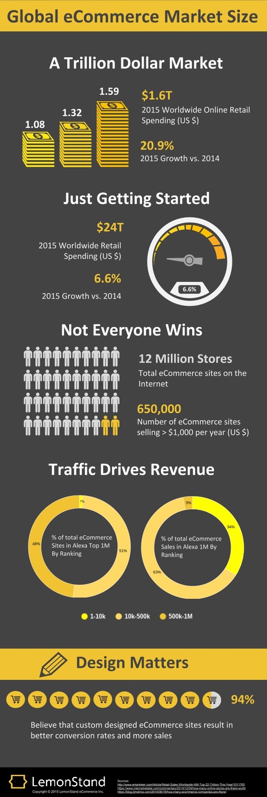 Robert Moore from RJMetrics took this a step further, identifying that 11 percent (110,000) of the top 1M websites on the internet by Alexa traffic ranking are eCommerce sites and calculating the distribution of these websites in total numbers as well as by share of retail sales, and came up with some very interesting results shown in the table below.