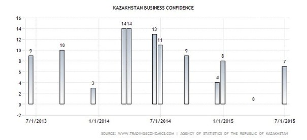 Business Confidence in Kazakhstan increased to 7 percent in the second quarter of 2015 from 0 percent in the first quarter of 2015.