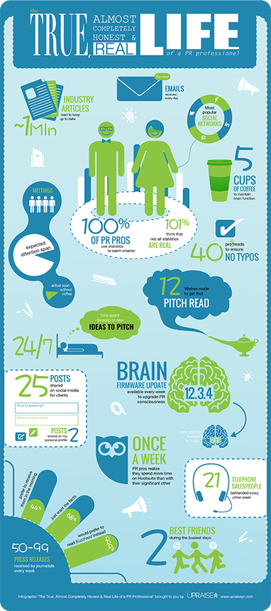 A life in public relations is unlike any other career you might imagine. For instance, did you know that PR pros need at least five cups of coffee just to maintain brain function? Or that while 100% of PR pros think that statistics are important, 101% believe that not all statistics are real.