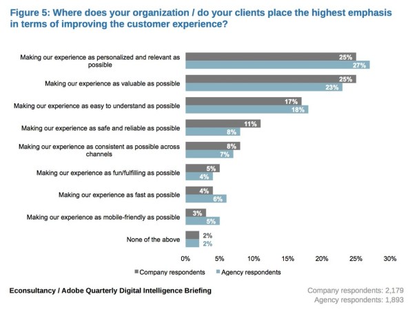 In the recent Econsultancy/Adobe Quarterly Digital Intelligence briefing, 25% of companies said they placed most emphasis on “making our experience as personalised and relevant as possible” in terms of improving the overall customer experience.